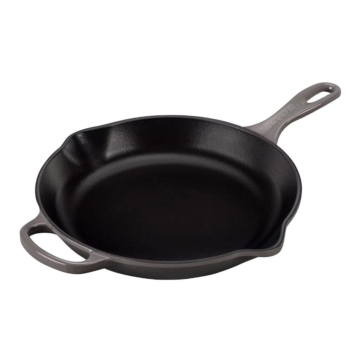 - 10.25” Signature Skillet: Baking, sautéing, and frying delicious food is easy and fun with the Signature Iron Handle 10.25” Skillet from Le Creuset. This enameled cast iron frying pan will become a staple in your daily cooking routine. It only gets better with age, too; over time a natural patina develops on the black enamel that is ideal for either searing or frying. This also means there is no need to season the cast iron. There is a large handle and a convenient helper handle on the opposite side to assist when carrying between the oven, stovetop, and table.