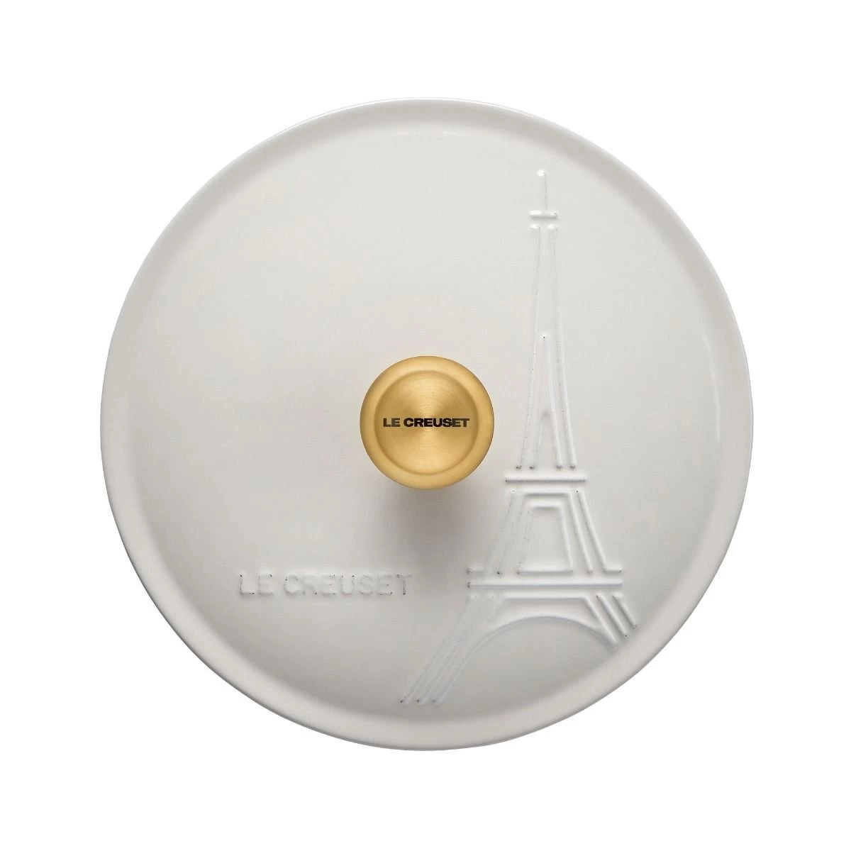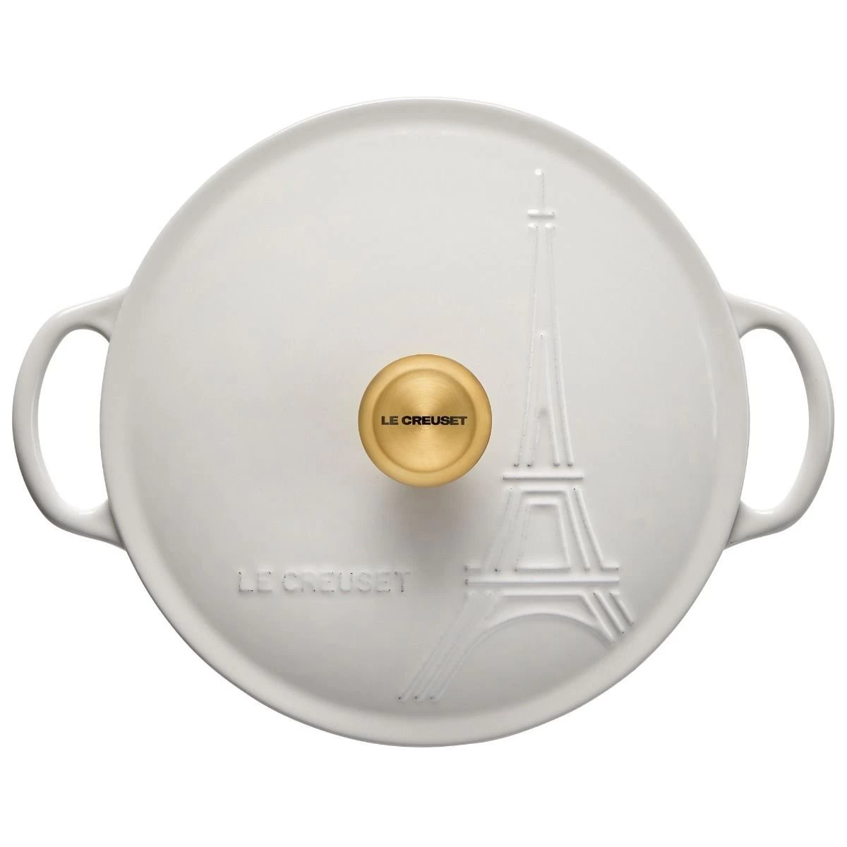From a sidewalk cafe and an afternoon spent exploring the shops on rue Saint-Dominique, to your dining table surrounded by family and friends, bring a touch of Paris to your home with the Eiffel Tower Collection from Le Creuset! Surprise the whole family with a hearty roast made tender in Le Creuset’s moisture-retaining 2.5Qt Signature Cocotte (White) Eiffel Tower Collection from the Signature Series. This beautiful round Dutch oven features a brushed gold stainless steel knob and a raised relief of the Eiffel Tower and Le Creuset nameplate on the lid with its beautiful chip-resistant enamel that lets you enjoy its beauty and quality for years to come.