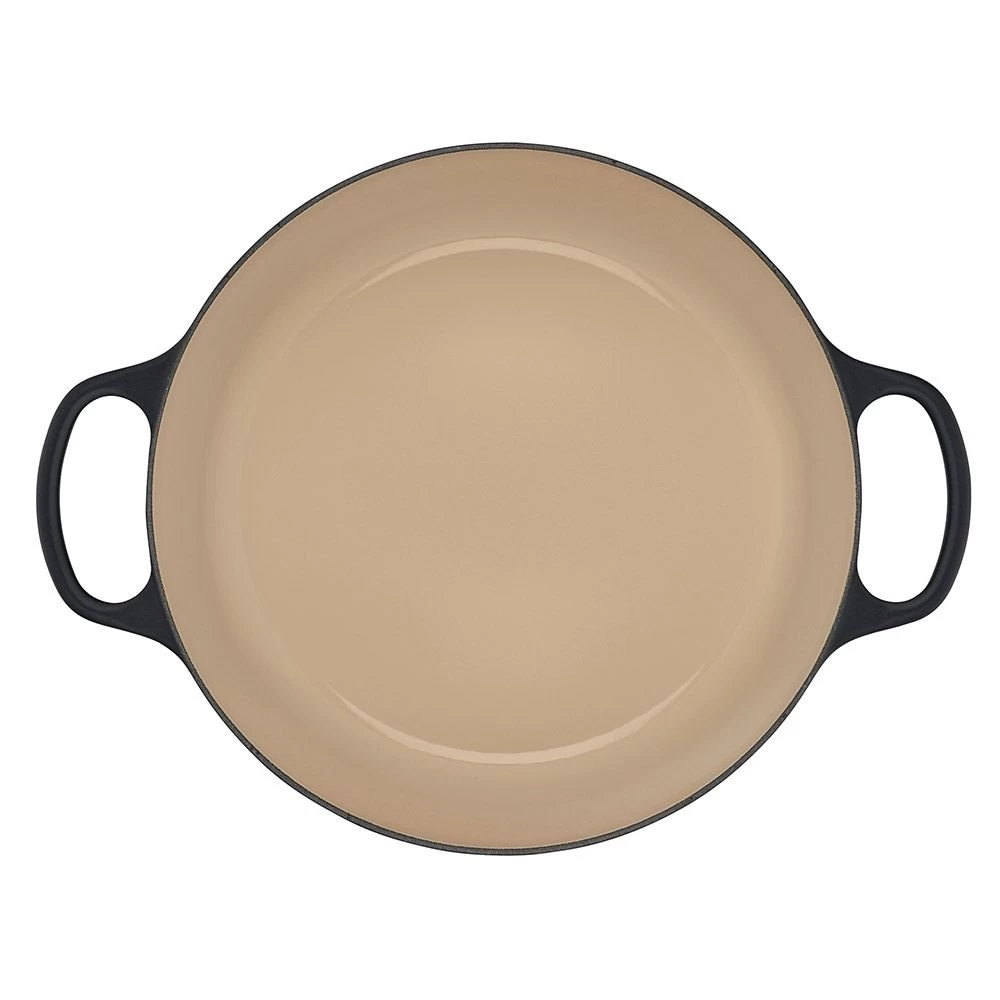- Sand-colored interior enamel has a smooth finish that promotes caramelization, prevents sticking, and resists stains
