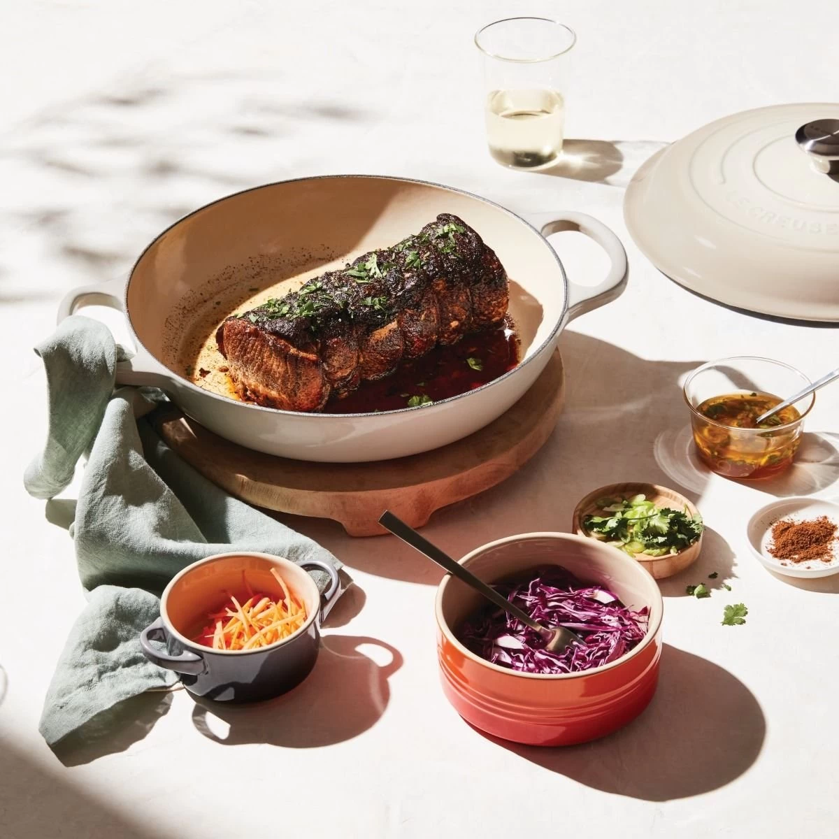 The ideal cooking vessel for turning tough cuts of roast into tender and juicy meals, the shape of this pan combined with the dome-shaped lid creates the ideal environment for braising. The exterior Meringue enamel resists chipping and cracking, and the interior finish promotes browning and resists sticking, and actually becomes better with age! Large ergonomic handles help you safely move your braiser from cooktop to oven to table. Add Le Creuset’s beautiful Meringue 3.5-Quart Enameled Cast Iron Braiser to your kitchen and making braised short ribs, brisket, lamb shanks, or pork carnitas will be easy!Â