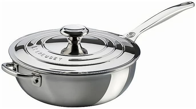 The Le Creuset Tri-Ply Stainless Steel Saucier Pan has innovations that will satisfy you deeply while you work. A self-sealing lid locks in moisture and flavors, while the steam relief vent eliminates boil-overs. The hollow-cast stainless steel stick handle stays cool to the touch, provides secure, ergonomic gripping with your safety in mind. The 3.5 Quart Le Creuset saucier chefs pan has high, flared sides and a rounded bottom to keeping ingredients moving and flowing during the cooking process for the smoothest gravies, sauces, custards, and any recipe that requires constant stirring. Le Creuset has turned its passion for cookware to the realm of stainless steel, and you can richly benefit from their commitment to quality and tradition. It is time to create with this Le Creuset Saucier Chefs Pan!