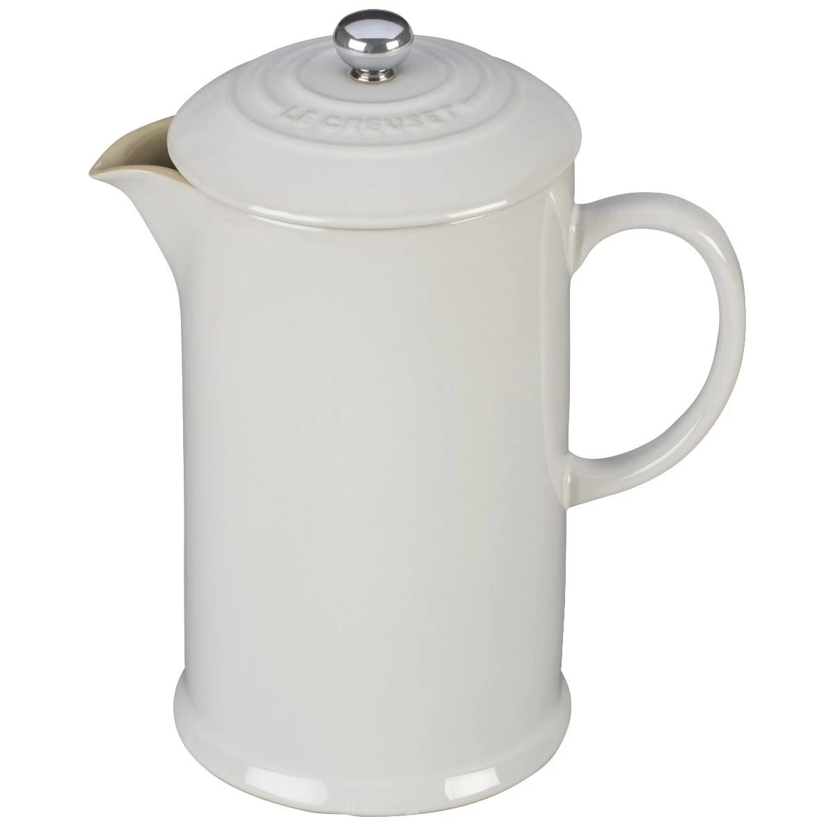 When you desire espresso with a deep richness in texture, aroma, and flavor, you likely seek out a French press as the optimum, traditional way of preparing that type coffee. The Le Creuset French Press Coffee Maker in White can provide this classic, full-bodied espresso while you enjoy that signature kitchen style. This Le Creuset stoneware ceramic French press has an integrated, fine-holed, stainless steel sieve to hold your coffee for pressing. The solid construction retains heat, so your espresso stays warmer longer. The thick interior porcelain enamel coating of the French press coffee maker repels stains and odors, so each different preparations remains fresh tasting over time. Discriminating cooks over the years know and trust Le Creuset for high standards of functional excellence, superior construction, and lasting style. It can be time to get your perfect cup of traditional espresso with the Le Creuset White French Press Coffee Maker.