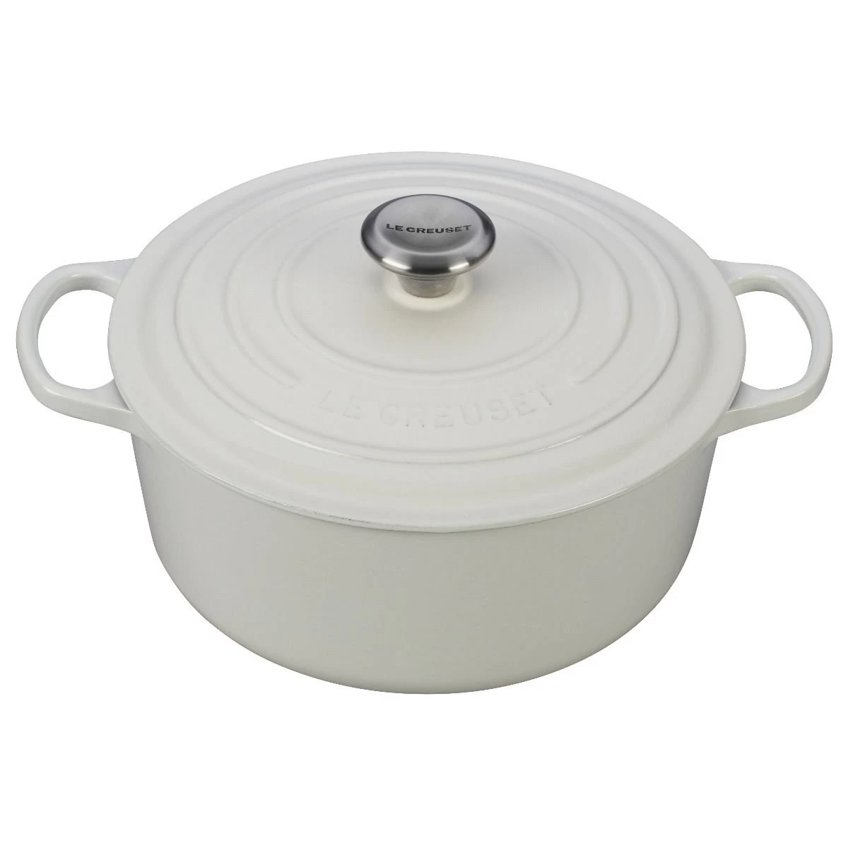 The 5.5qt Le Creuset Signature Cast Iron Dutch Oven is made of oven safe enameled cast iron offered in a variety of colors. This white enameled Le Creuset Signature Round French Oven has a clean and classic style all its own. Like all Le Creuset enameled cast iron cookware it is recommended that you hand wash, but this cast iron french oven is dishwasher safe making clean up easy.