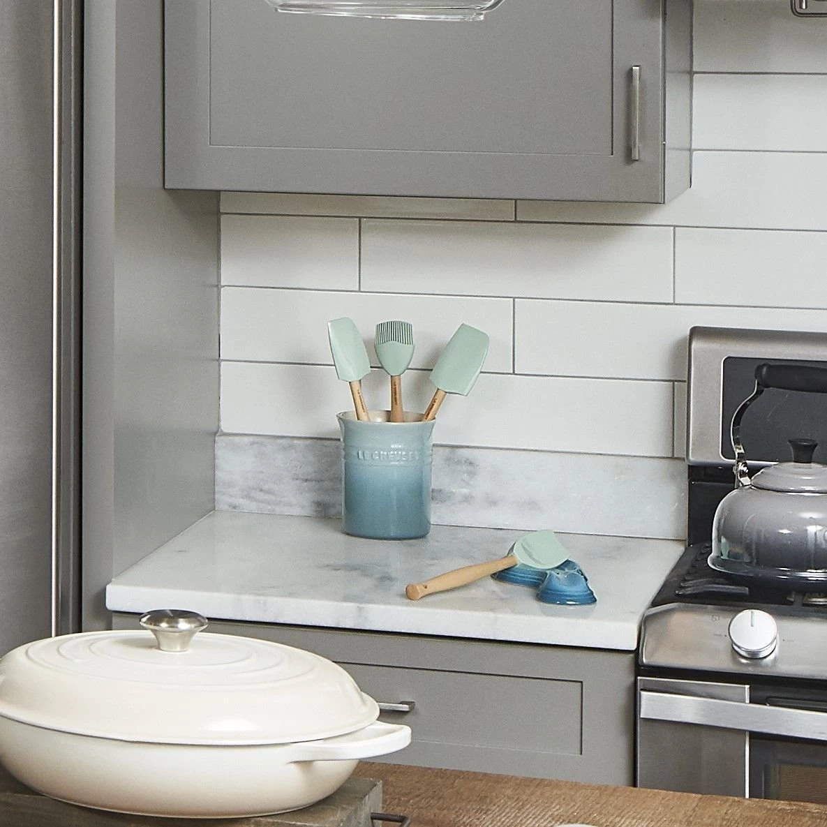 From creamy dips to savory sauces this Le Creuset Craft Series 5pc Kitchen Utensil Set with Crock in Sea Salt will stir, scoop, spread or scrape with ease! The flexible silicone tip scrapes the bowl clean and will not scratch cookware – even non-stick cookware! The easy-to-clean removable silicone heads are dishwasher-safe for easy cleanup and to better preserve the wooden handles. The smooth wooden handles provide a comfortable, slip-free hold with grip rings for added control. Detailed in Le Creuset’s striking yet subtle Sea Salt blue, this utensil set makes waves in your kitchen by complementing other pieces from the Sea Salt collection, or stands out against mixed shades.Â