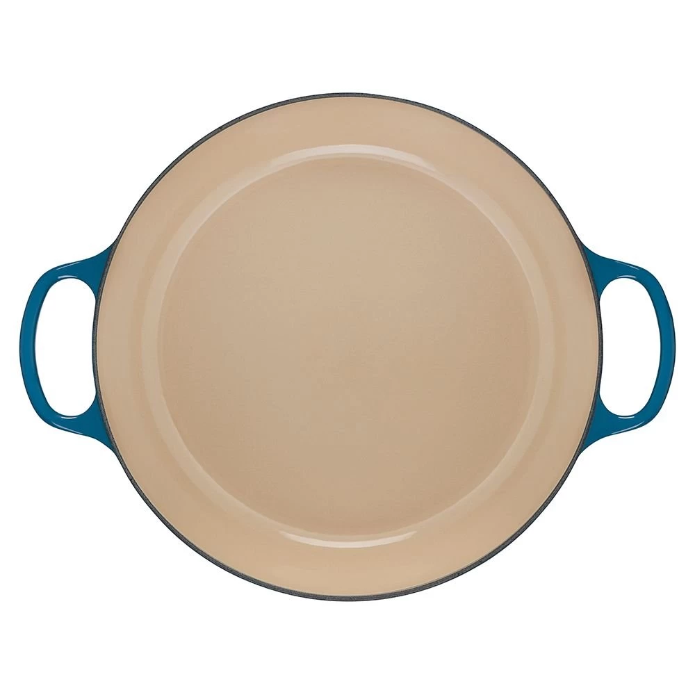 - Sand-colored interior enamel has a smooth finish that promotes caramelization, prevents sticking, and resists stains