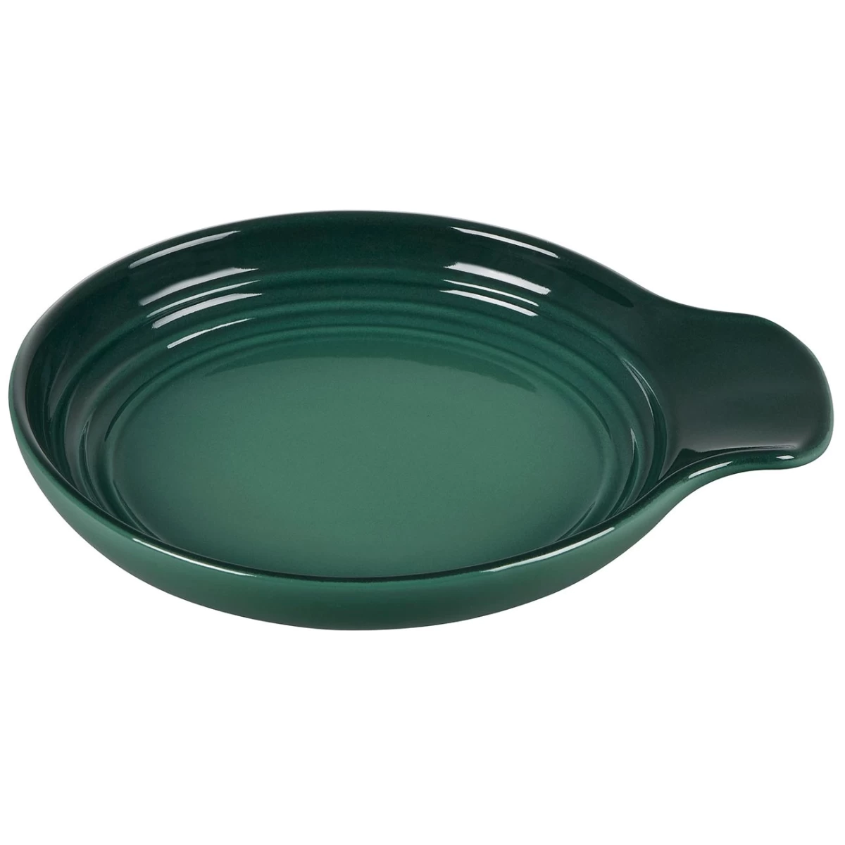 Protect your tablecloth and countertops from unnecessary food mess with the Le Creuset 6″ Spoon Rest in Artichaut. This stoneware spoon rest’s side groove secures your utensil’s handle while the large, circular bowl supports utensils of any size and catches drips and splashes. Whether you’re ladling out savory brown gravy, passing around juicy burgers or serving up heaping spoonfuls of homemade cobbler, bring this gorgeously-colored spoon rest along to the table for an accessory that is both functional and stylish. When it’s time to clean up, this spoon rest’s glazed interior is almost as good as nonstick for rinsing off foods or can be placed in the dishwasher.