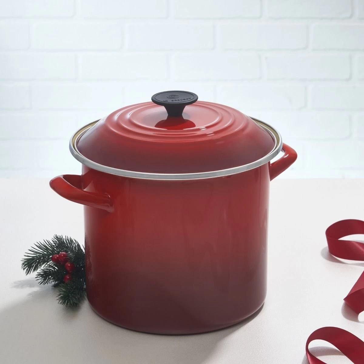 Stock pot cooking has never been so hot. LeCreusets bright and flashy Cherry red porcelain enamel stock pot is sure to grab attention. The design of these LeCreuset stock pots limits evaporation causing liquids to mix and bubble together giving your entire dish rich flavor. Safe to use on any heat source from electric to halogen. The stainless steel rim helps to prevent cracking of chipping of the sleek cherry porcelain enamel. Follow simple care instruction to ensure enjoyment of your LeCreuset 8qt stock pot for years to come.