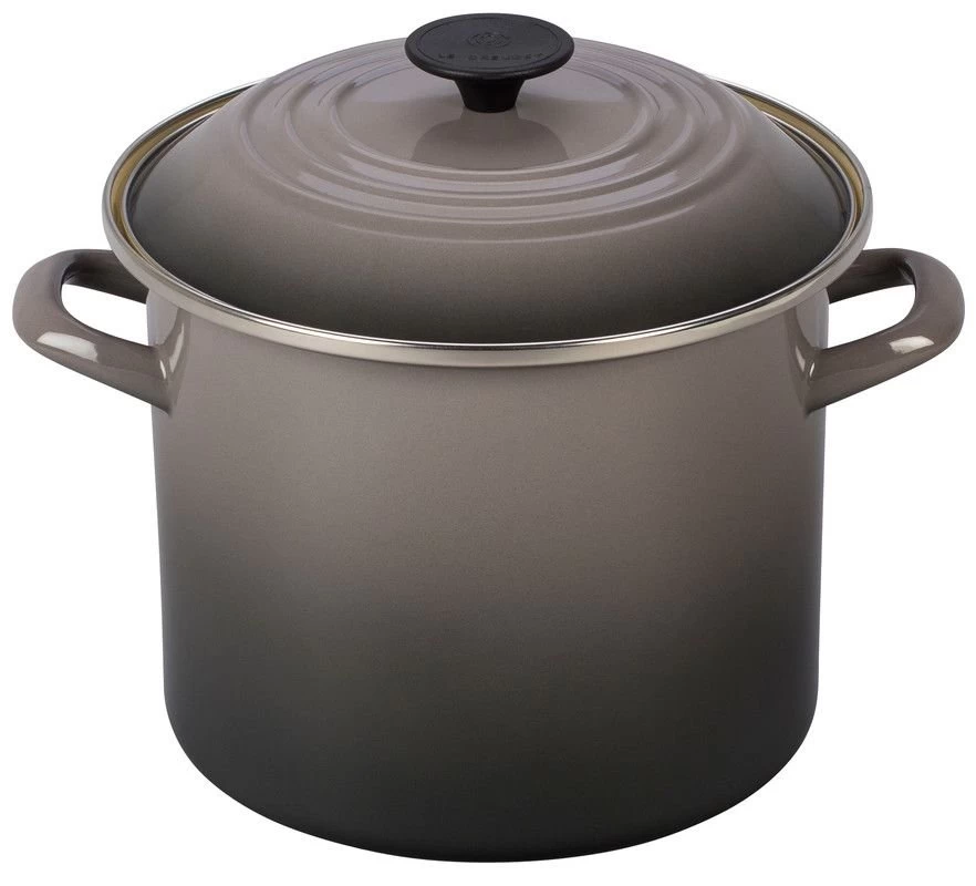 Bright and cheery this Le Creuset Stock Pot in Oyster Grey is sure to liven up any kitchen. The design of this Le Creuset stockpot limits evaporation causing liquids to mix and bubble together giving your entire dish rich flavor. Safe to use on any heat source from electric to halogen. The stainless steel rim helps to prevent cracking of chipping of the sleek Oyster Grey porcelain enamel. Follow simple care instruction to ensure the enjoyment of your LeCreuset 8 qt stockpot for years to come.Â
