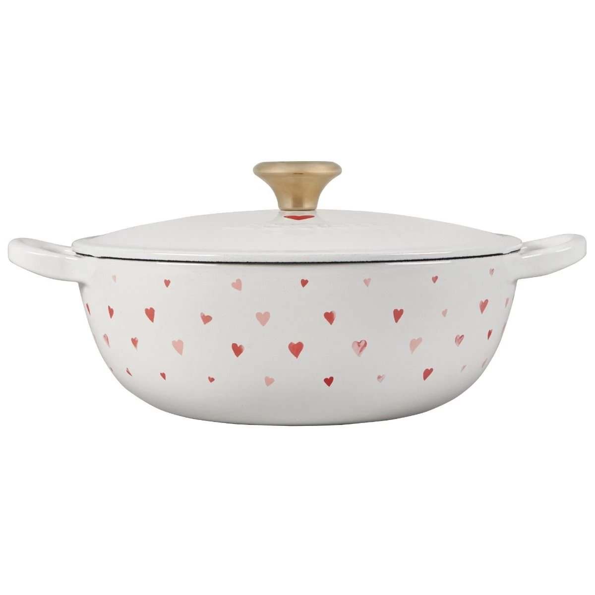 - Red & pink applique hearts adorn the cast iron chef’s oven on a white background with a single heart on the gold knob lid
