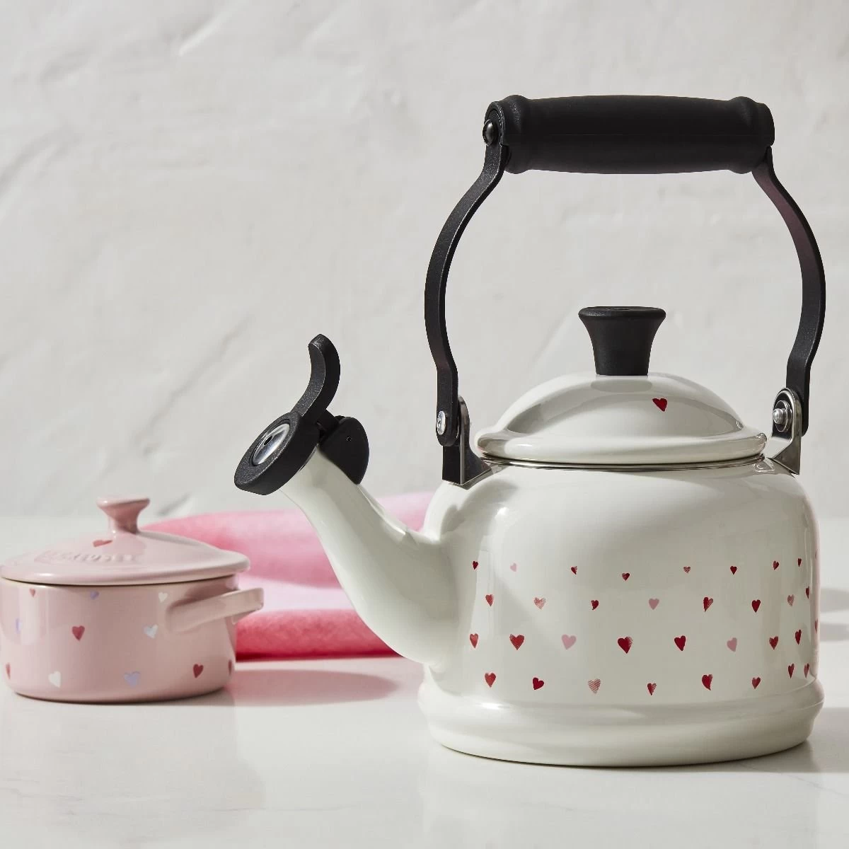 Bring a little love to the table with the Le Creuset L’Amour Collection 1.25 Qt. Demi Kettle! Crafted from lightweight carbon steel with a striking porcelain enamel finish, this kettle will make a statement when serving loved ones during anniversary celebrations, engagement parties, or an intimate Valentine’s Day tea toast for two. The classic Le Creuset White finish is decorated with sporadically placed red and pink hearts – adding an air of affection to your tabletop that is sure to show family and loved ones you care. The generous base size lets the kettle make greater contact with the heating element, ensuring stovetop versatility and a quick boil time. A single-tone whistle clearly rings when water reaches a boiling point, preventing the kettle from boiling dry and ensuring no minute is wasted on preparing your cup of tea. Perfect for complementing other pieces of the L’Amour Collection and covered by a 5-Year Le Creuset Warranty, the Le Creuset L’Amour Collection 1.25 Qt. Demi Kettle will fill loved ones’ mugs with love for years to come.