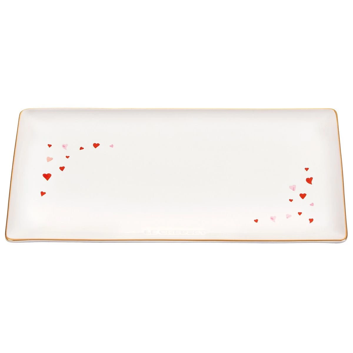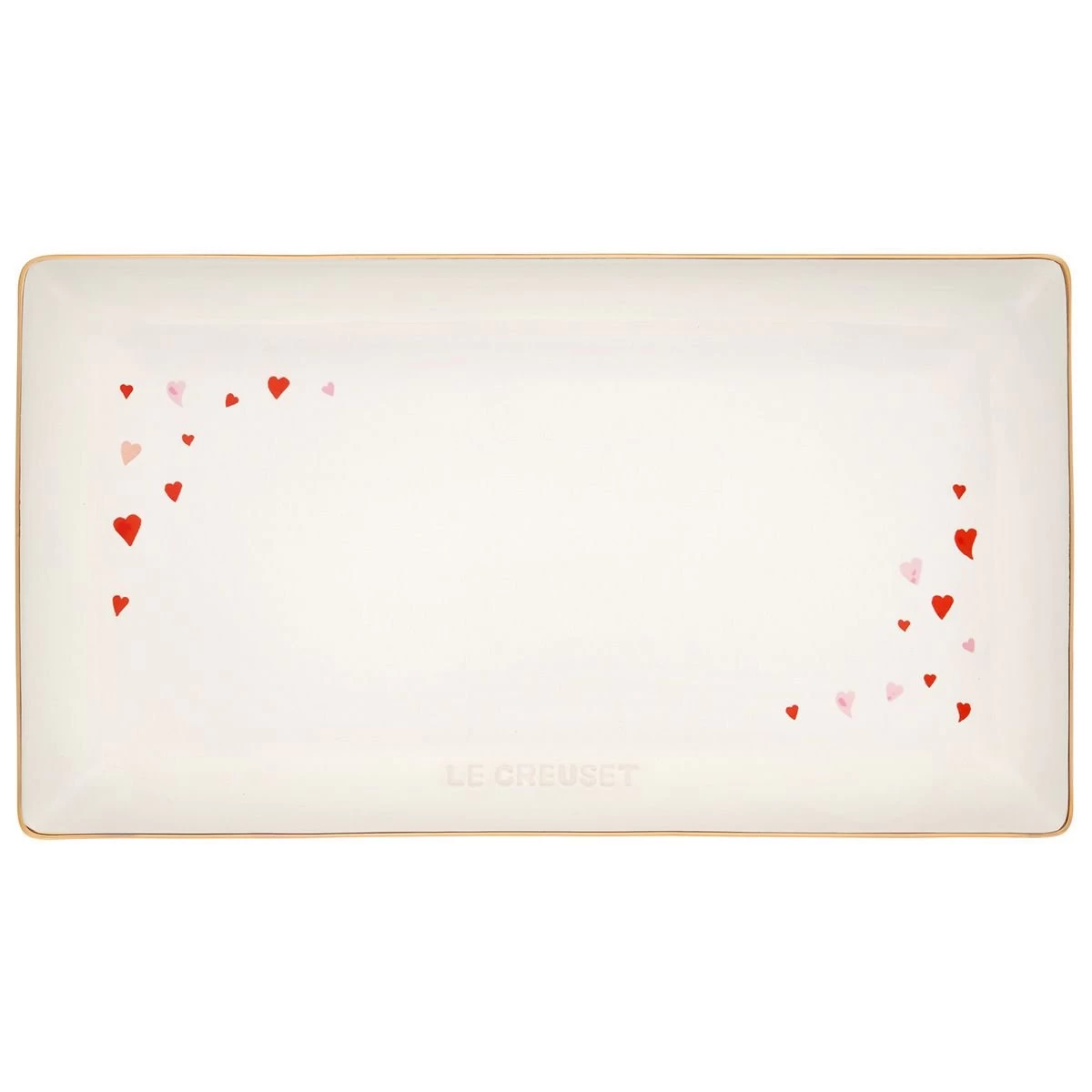 Bring a little love to the table with the Le Creuset L’Amour Collection 11.25″ x 6.25″ Rectangular Hostess Tray! This festive serving tray is crafted from premium, high-quality stoneware and features whimsical hearts in shades of red and pink against Le Creuset’s radiant white glaze that’s chip, scratch, stain, & shock-resistant. It’s finished with a real gold rim along the edges for a truly elegant presentation. Perfect for serving treats, hors d’oeuvres, and desserts around Valentine’s Day, this stoneware tray provides superior heat retention to keep your food warm or cold while serving.Â