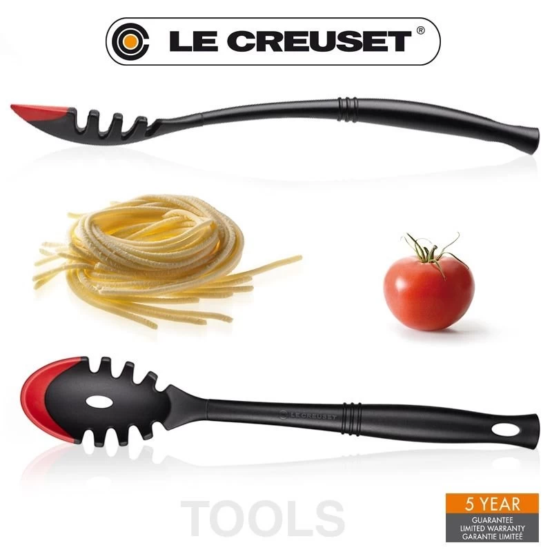 Serve up spaghetti neatly and easily with the Revolution® Bi-Material Pasta Spoon by Le Creuset. Designed to improve even the toughest cooking tasks, Revolution® tools are made with a pliable combination of flexible silicone and rigid glass-reinforced nylon so they conform to the edges of pots and pans while retaining strength and durability. This Pasta Spoon in black and Cerise/Cherry Red has an elliptical handle with grip rings for comfort and control. It’s perfect for lifting, portioning, and serving spaghetti, linguini, and angel hair pasta.